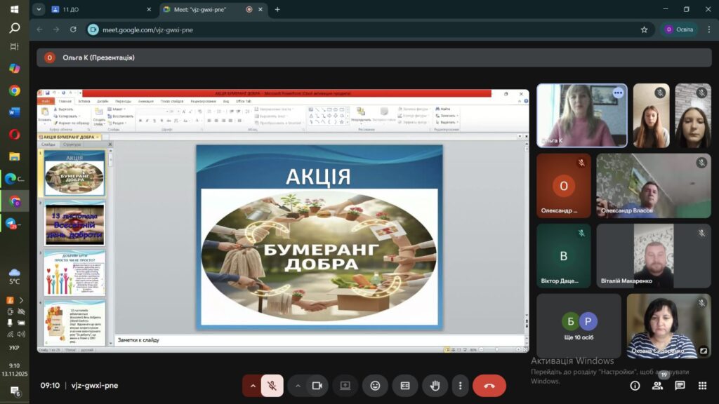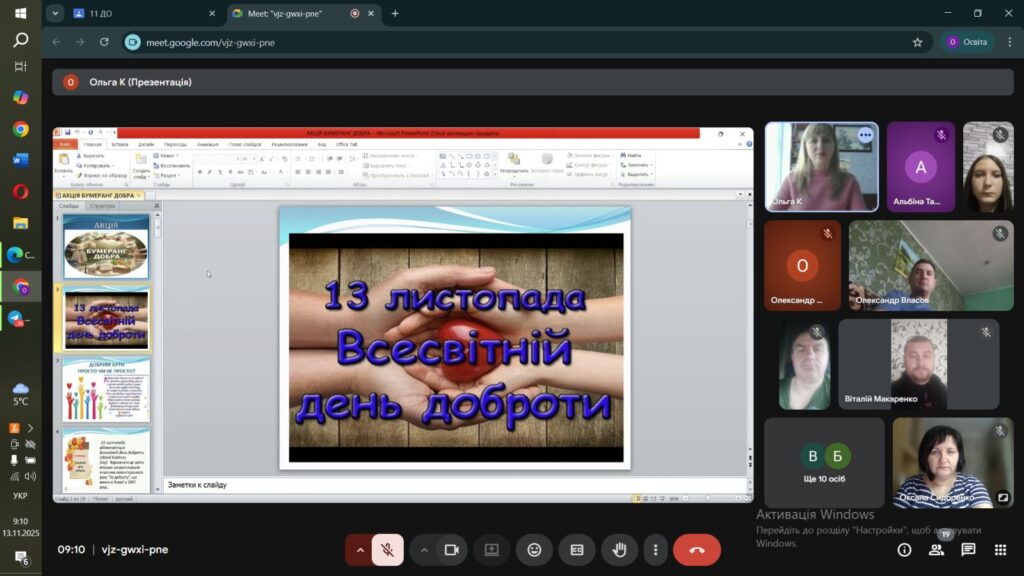Головна мета акції «Бумеранг добра», проведеної практичним психологом Ольгою Капоріною з нагоди Всесвітнього дня доброти (13 листопада), полягала у формуванні та поглибленні ціннісних орієнтацій здобувачів освіти на доброту, емпатію та активну моральну позицію, а також у демонстрації причинно-наслідкового зв’язку добрих вчинків.
