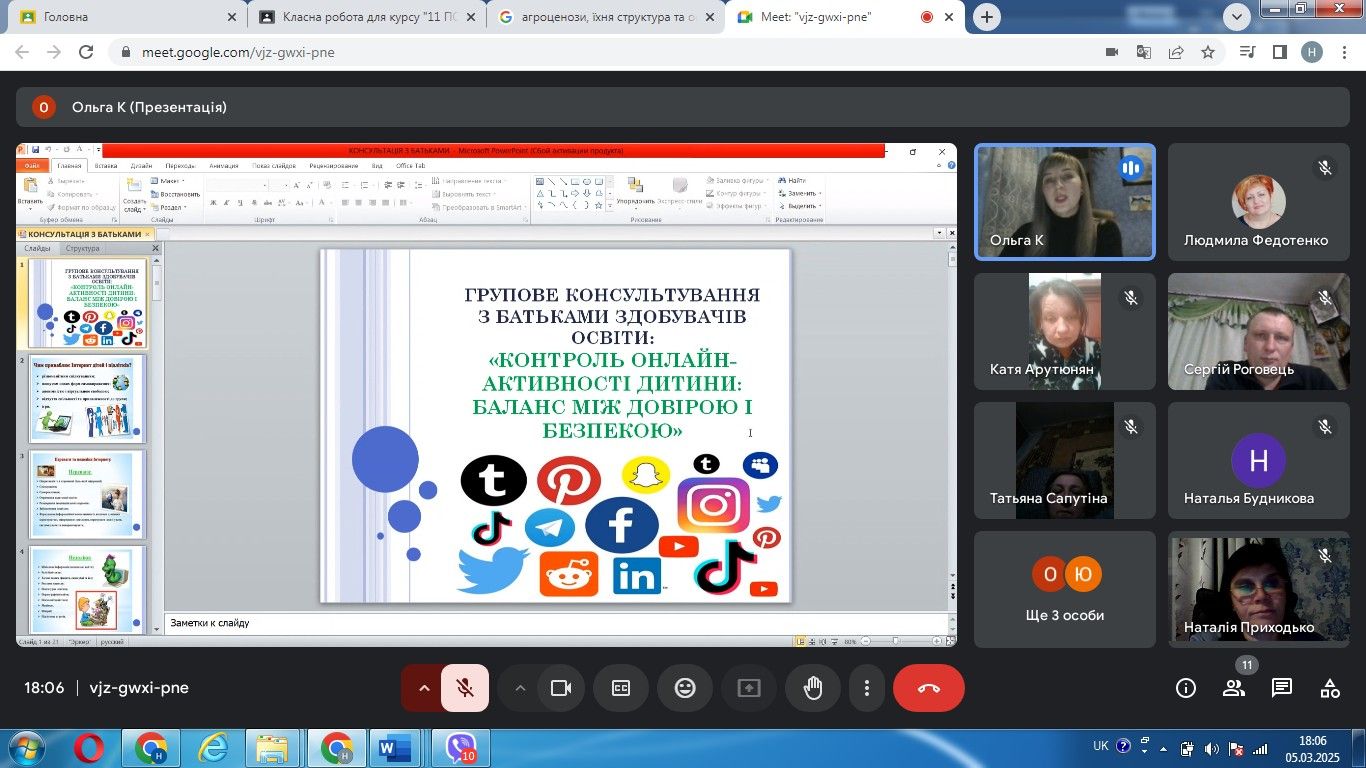 05 березня 2025 року з батьками здобувачів освіти практичним психологом Ольгою Капоріною було проведено групове консультування «Контроль онлайн-активності дитини: баланс між довірою і безпекою».