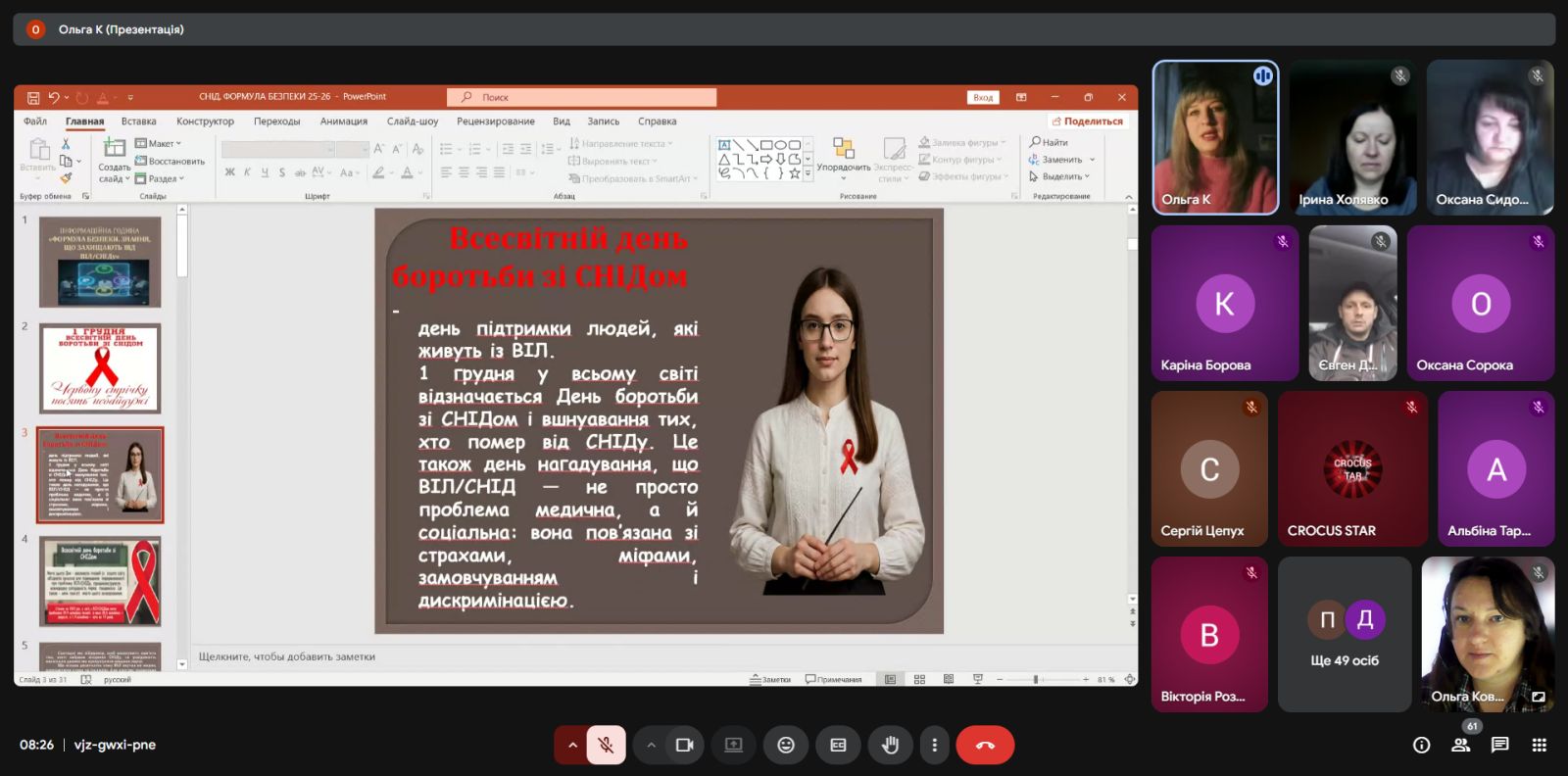 З метою привернення уваги світової спільноти до проблеми ВІЛ/СНІДу, підвищення поінформованості, демонстрації міжнародної солідарності перед пандемією, вшанування пам’яті жертв захворювання та підтримки людей, які живуть із ВІЛ, практичним психологом Ольгою Капоріною 01 грудня 2025 року з учасниками освітнього процесу була проведена інформаційна година «Формула безпеки. Знання, що захищають від ВІЛ/СНІДу».