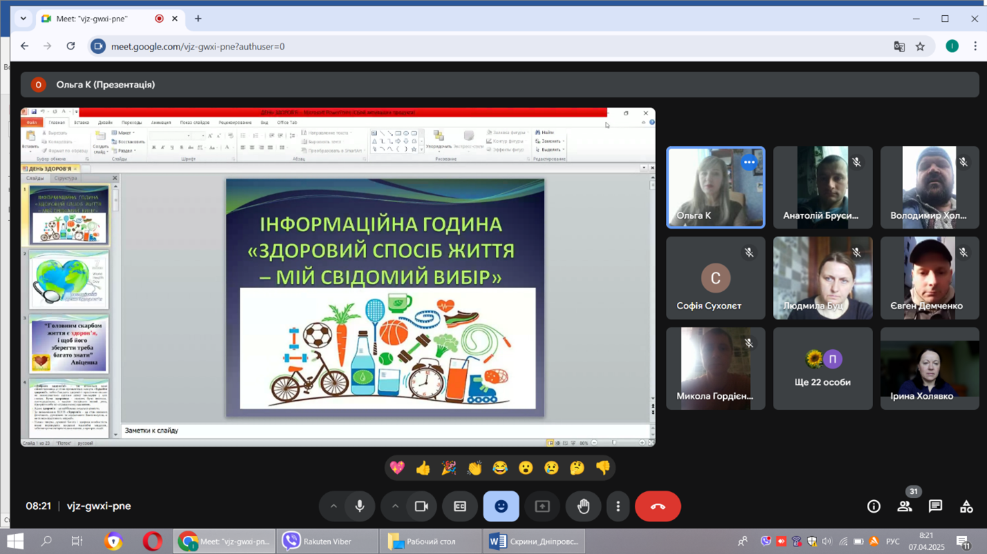 07 квітня 2025 року з нагоди Всесвітнього дня здоров’я з учасниками освітнього процесу практичним психологом Ольгою Капоріною була проведена інформаційна година «Здоровий спосіб життя – мій свідомий вибір».