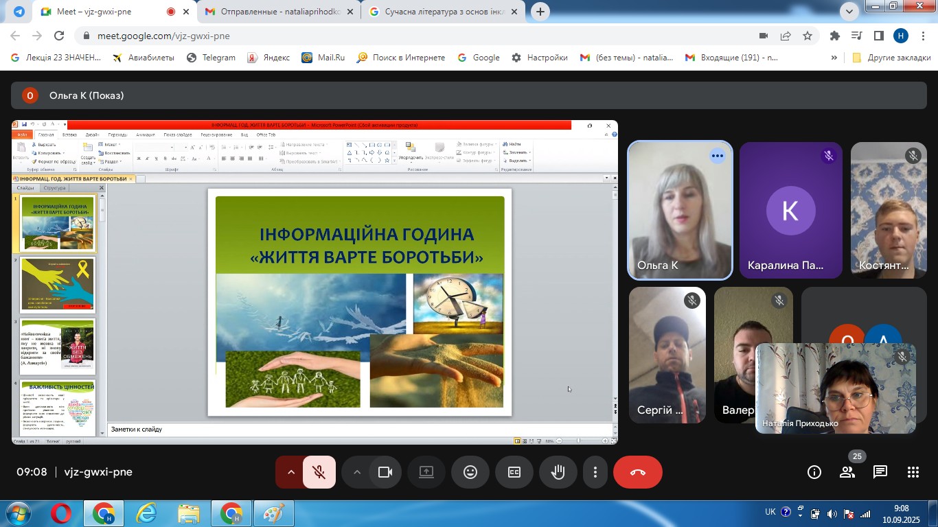 10 вересня 2025 року, з нагоди Всесвітнього дня запобігання самогубствам, практичний психолог Ольга Капоріна провела інформаційну годину на тему «Життя варте боротьби».
