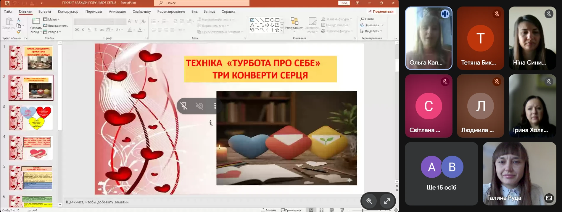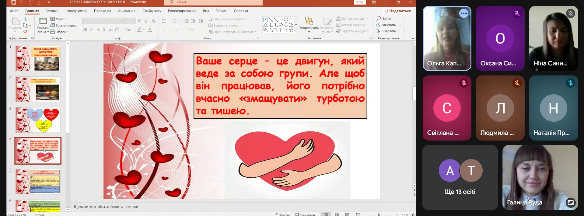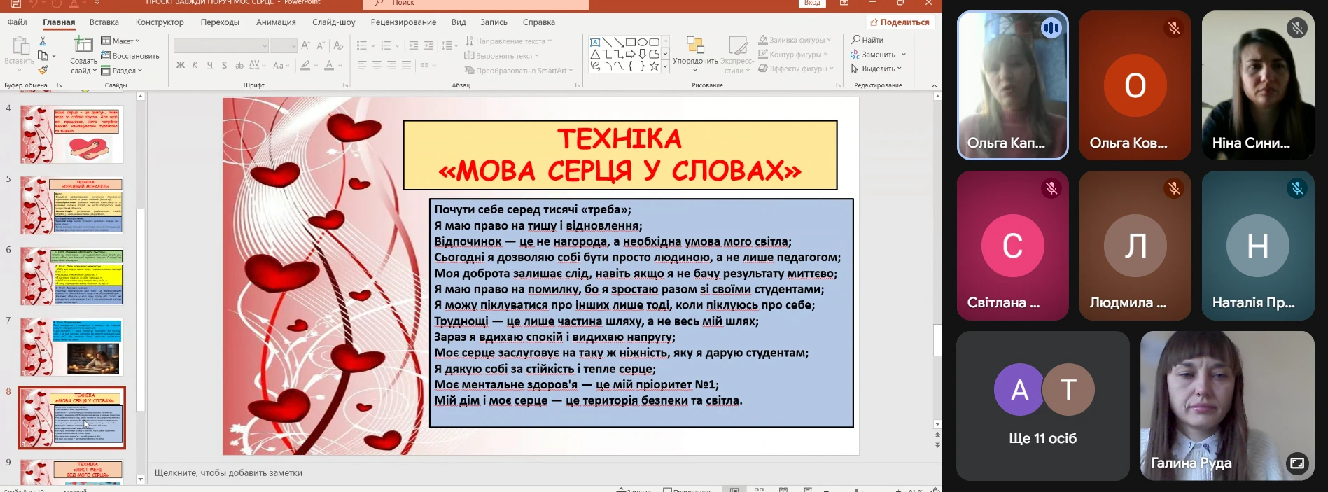 У рамках проєкту «Завжди поруч» 9.02.2026 року практичний психолог Ольга Капоріна на черговій ранковій зустрічі з викладачами провела захід, спрямований на психологічну підтримку та самовідновлення педагогів під назвою «Що моє серце хоче сказати сьогодні».