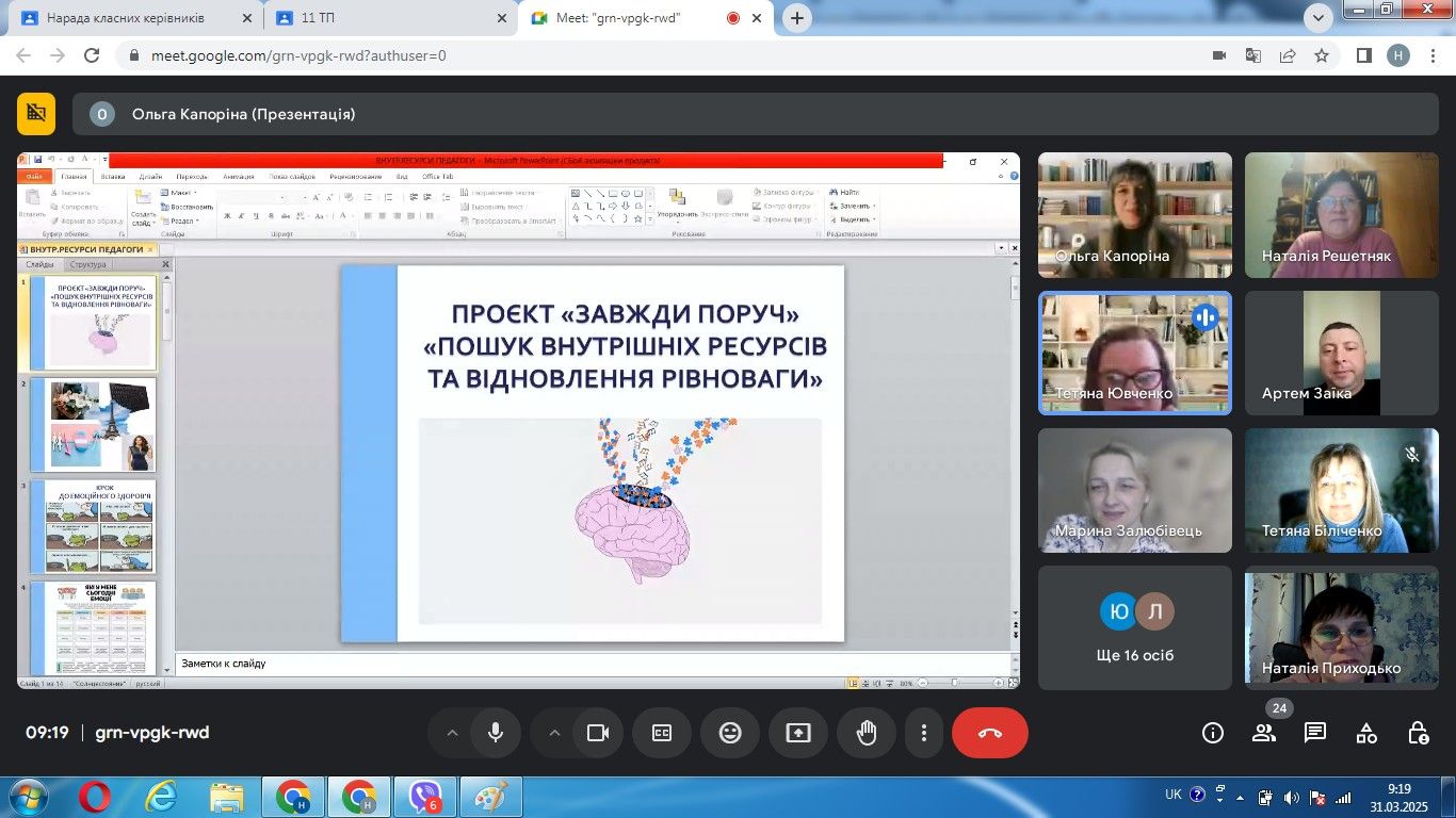 31 березня 2025 року в рамках проєкту «Завжди поруч» практичним психологом Ольгою Капоріною була проведена чергова ранкова зустріч з педагогами «Пошук внутрішніх ресурсів та відновлення рівноваги».