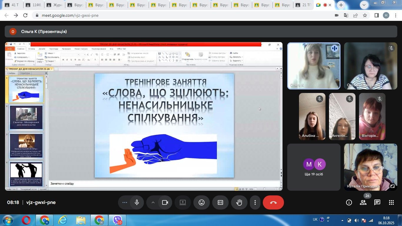 06 жовтня 2025 року до Міжнародного дня ненасилля, що відзначається щороку 02 жовтня, практичним психологом Ольгою Капоріною зі здобувачами освіти було проведене тренінгове заняття «Слова, що зцілюють: ненасильницьке спілкування». Захід мав на меті просвіту щодо різних форм насильства та навчання учасників практичним навичкам ненасильницького спілкування як інструменту зцілення та конструктивної взаємодії.