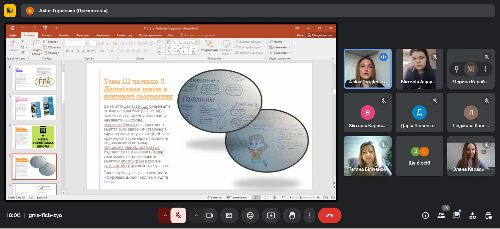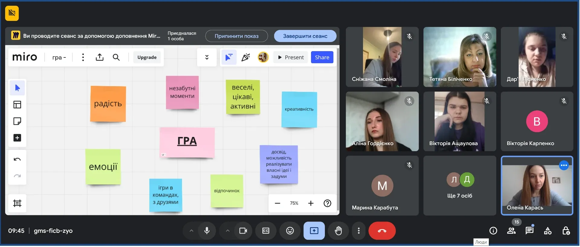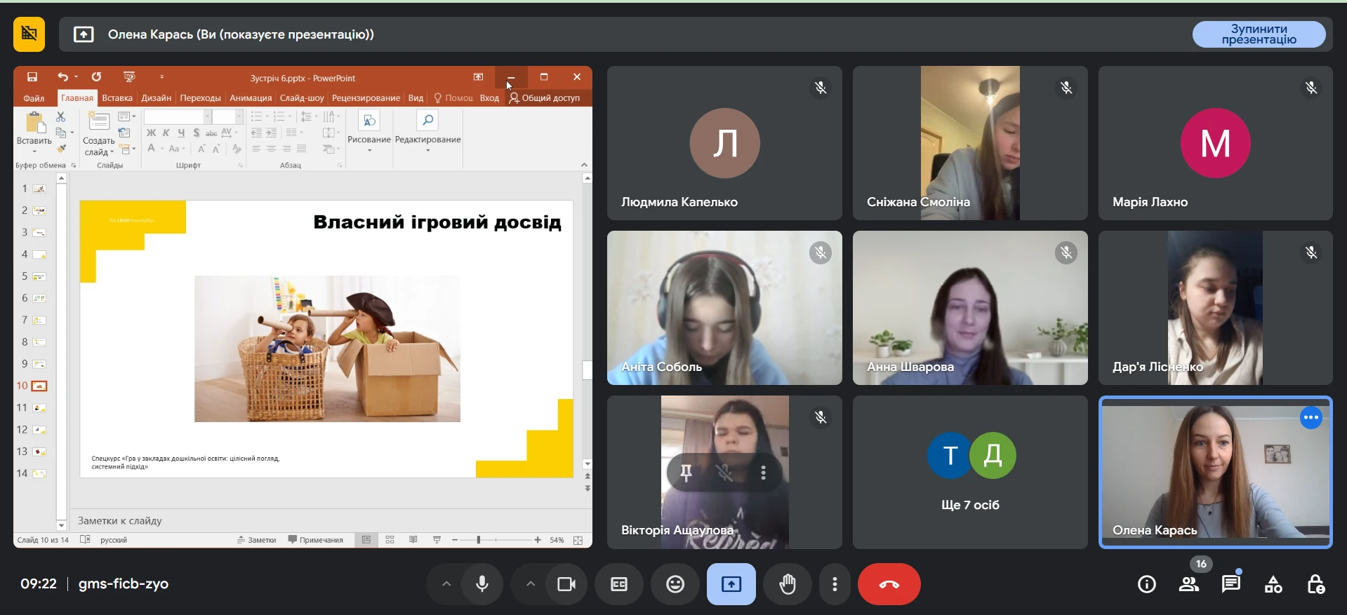 28 лютого 2025 р. на чергове заняття спецкурсу, який викладає досвідчений педагог доктор філософії Олена Карась, доєдналися тренери The Lego Foundation Стефанія Чубакова й Анна Шварова, а також завідувач відділення дошкільної і середньої освіти Людмила Капелько та голова ЦК професійно-педагогічної підготовки Тетяна Біліченко. Заняття на тему «Гра як відкрита система» пройшло у формі тренінгу, під час якого всі учасники доєдналися до виконання пальчикових ігор, ознайомилися з парціальною програмою розвитку дитини від 2 до 6 років «Творці майбутнього», пригадали та креативно відтворили особистий ігровий досвід з дитинства, зазначили характеристики гри на стікерах віртуальної дошки. Студентка 31 ДО групи спеціальності 012 Дошкільна освіта Аліна Гордієнко презентувала присутнім власне Play Portfolio за результатами вивчення спецкурсу в 2023-2024 н.р.
