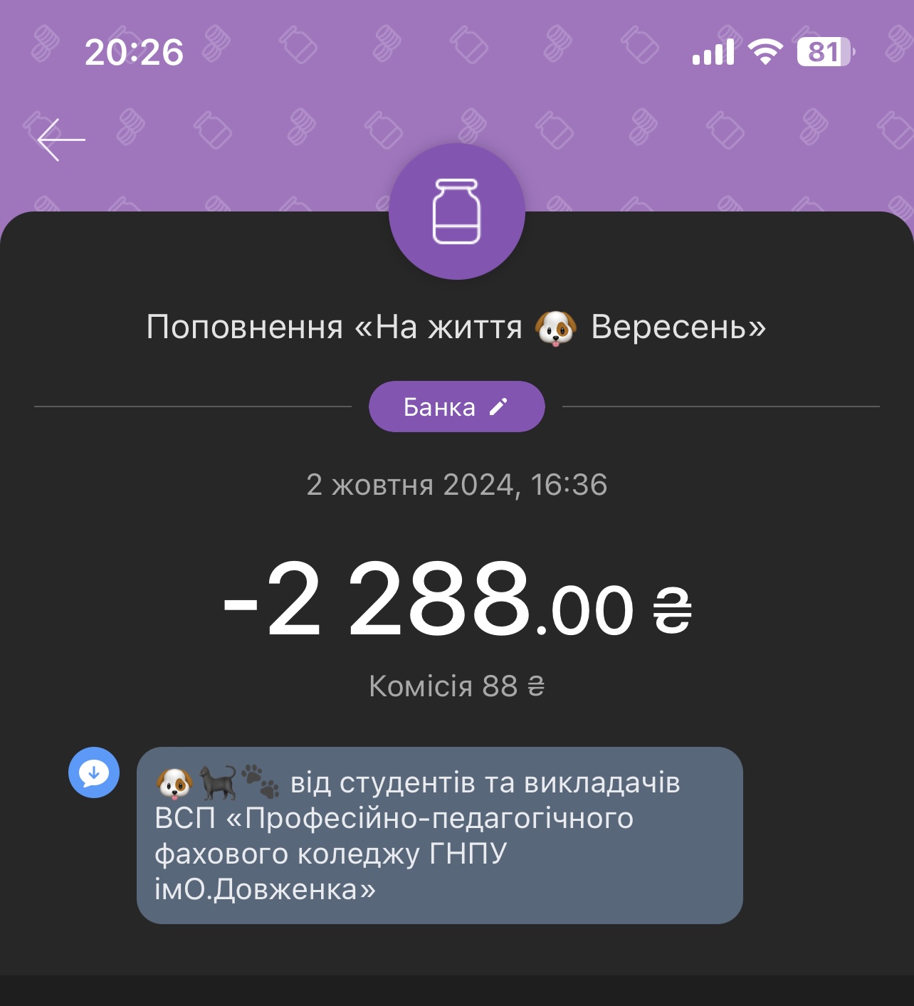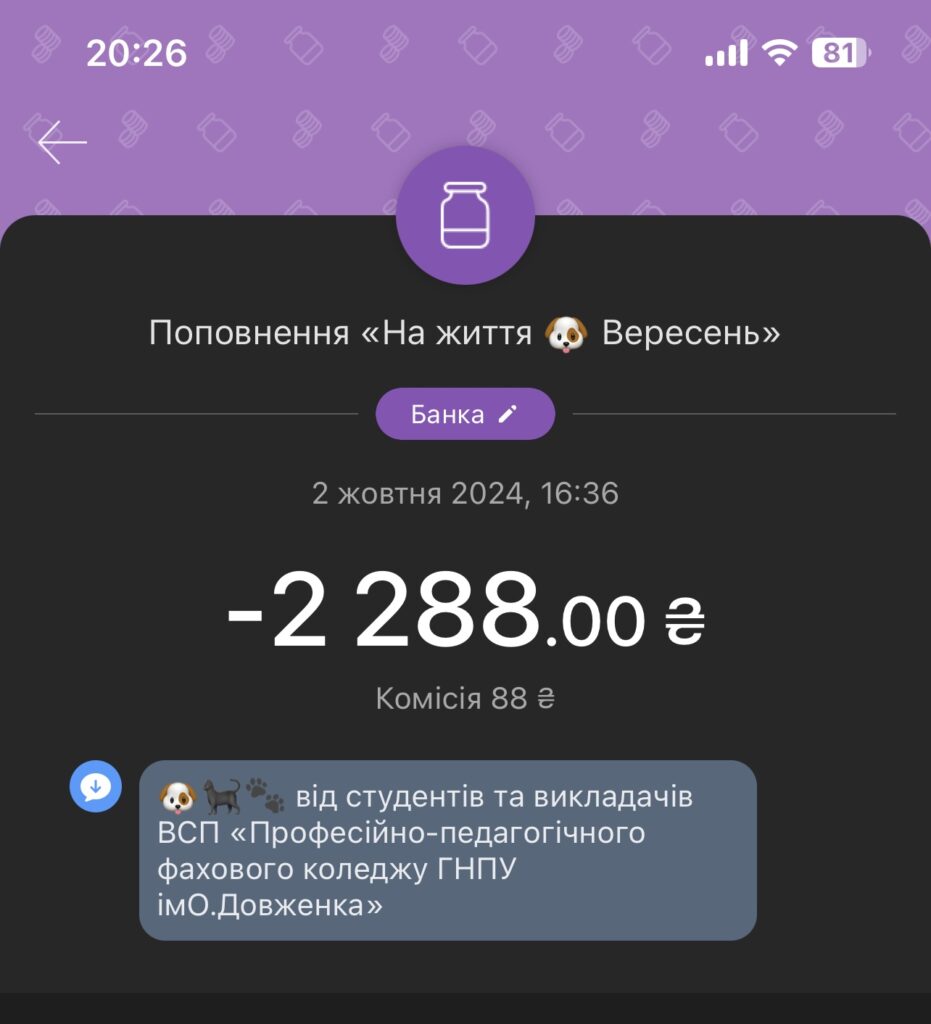 Зібранні кошти в сумі 2288 грн. було передано притулку «Kit.pes.hlukhiv» (м. Глухів) на будівельні матеріали для розбудови вольєрів безпритульним тваринам.