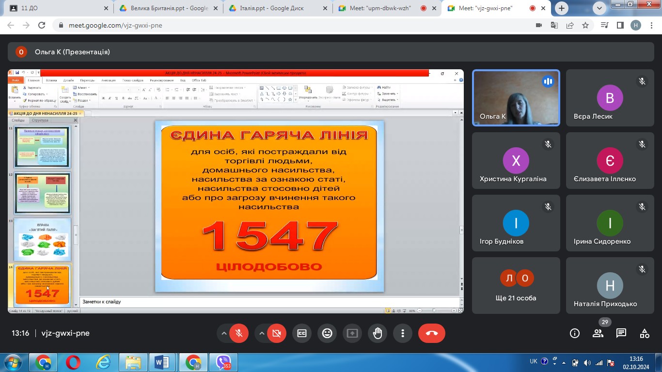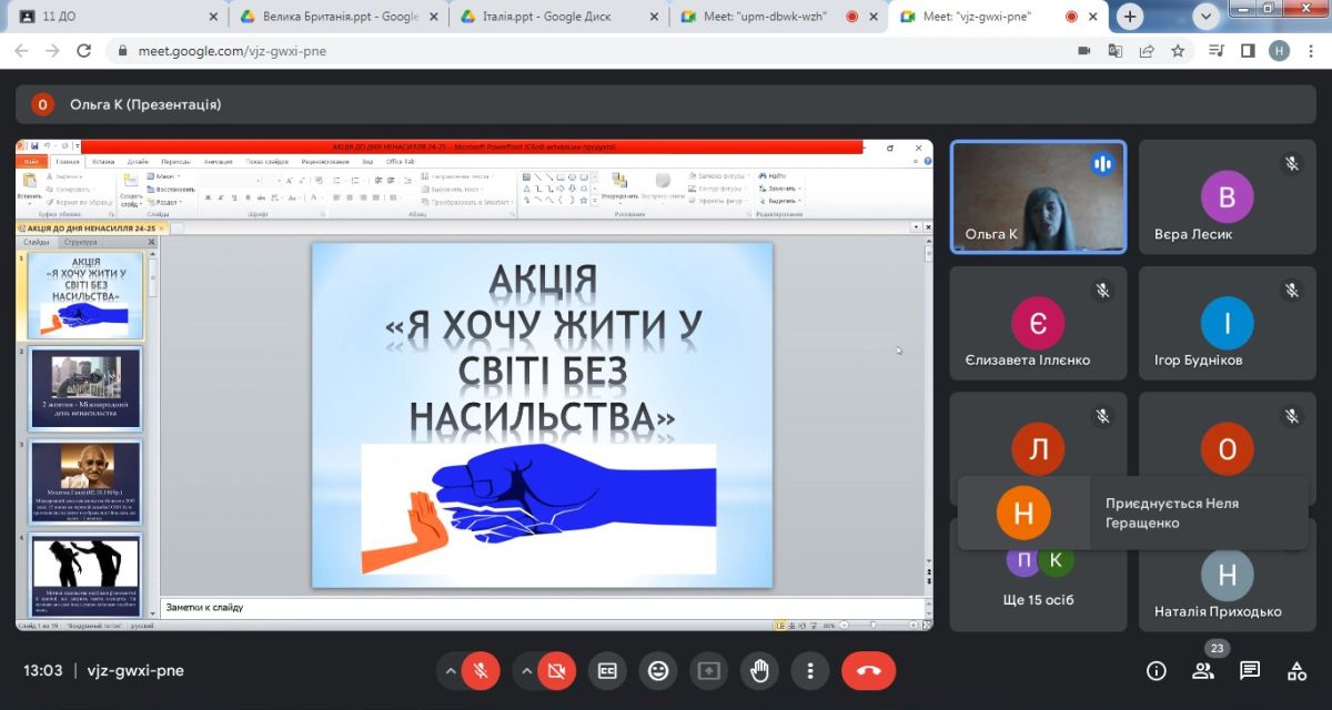 02 жовтня 2024 року з нагоди Міжнародного дня ненасилля, що відзначається щороку 2 жовтня, практичним психологом Ольгою Капоріною була проведена акція «Я хочу жити у світі без насильства». Її мета полягала в ознайомленні учасників освітнього процесу з даною датою, а в подальшому, як уникнути та попередити насильство серед студентів, педагогів та батьків.
