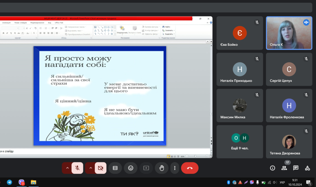 10 жовтня 2024 р. з нагоди Всесвітній день психічного здоров’я, що відзначається щороку 10 жовтня психологом практичним Ольгою Капоріною з учасниками освітнього процесу була проведена акція «З турботою про себе». За допомогою психологічних технік та вправ здобувачі освіти вчилися врегульовувати власні почуття, спокійніше реагувати на оточуючі обставини та діяти корисно як для себе, так і для оточуючих.
