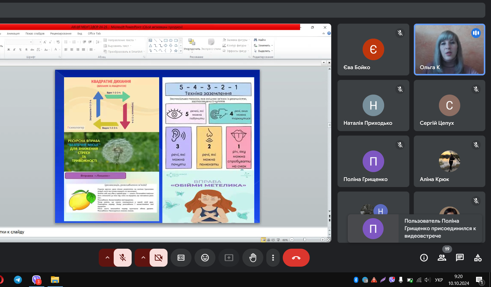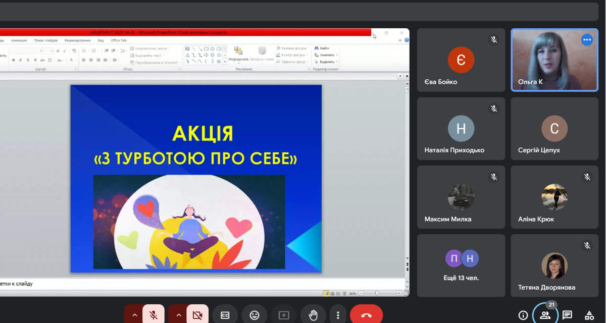 10 жовтня 2024 р. з нагоди Всесвітній день психічного здоров’я, що відзначається щороку 10 жовтня психологом практичним Ольгою Капоріною з учасниками освітнього процесу була проведена акція «З турботою про себе». За допомогою психологічних технік та вправ здобувачі освіти вчилися врегульовувати власні почуття, спокійніше реагувати на оточуючі обставини та діяти корисно як для себе, так і для оточуючих.