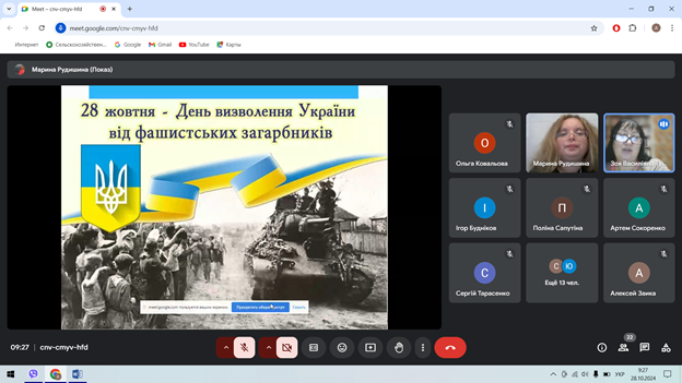 28 жовтня 2024 року з нагоди річниці визволення України від фашистських загарбників, що відзначається щороку 28 жовтня, бібліотекарем коледжу Мариною Рудишиною було проведено бібліотечний урок «Визволення України: ціна перемоги».