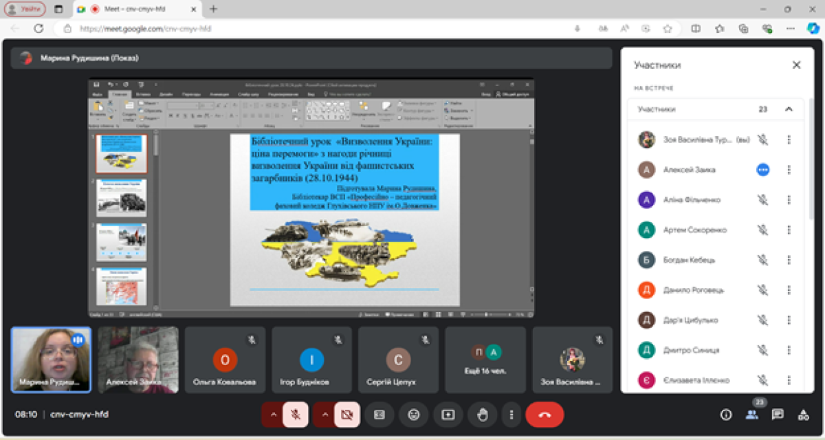 28 жовтня 2024 року з нагоди річниці визволення України від фашистських загарбників, що відзначається щороку 28 жовтня, бібліотекарем коледжу Мариною Рудишиною було проведено бібліотечний урок «Визволення України: ціна перемоги».