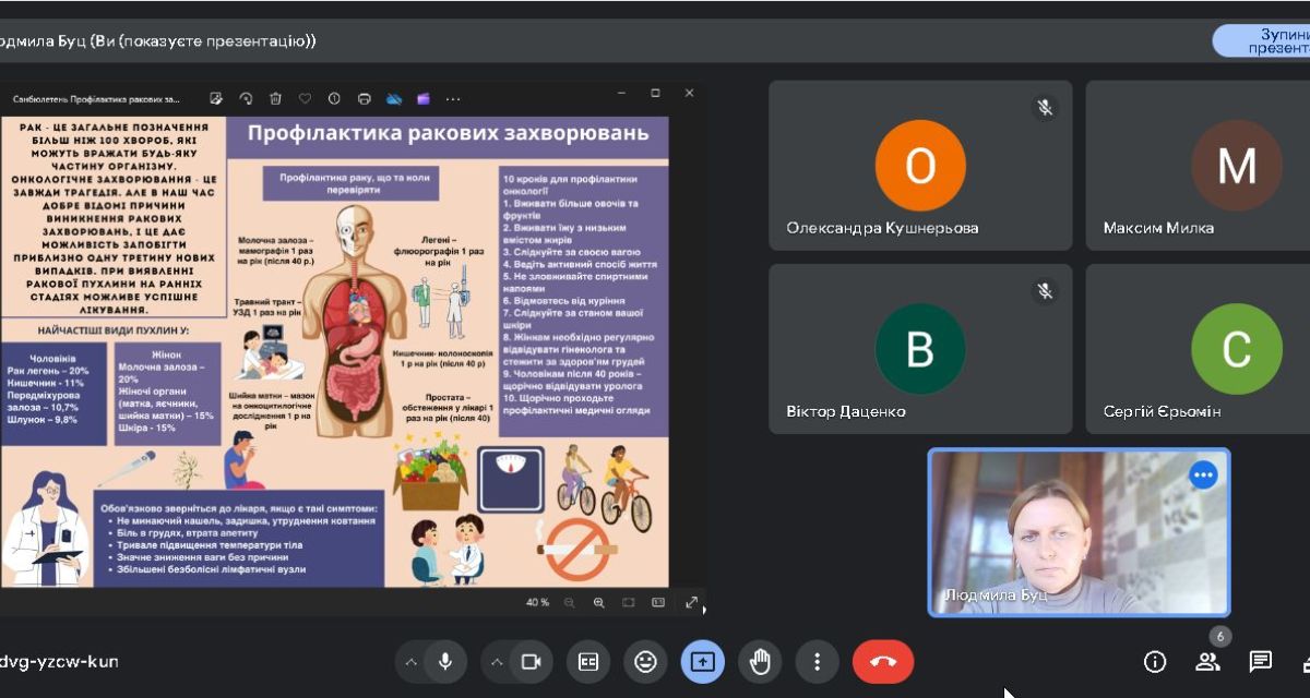22 жовтня 2024 року в рамках роботи лекторію «Здоров‘я» та відповідно до плану роботи наркопосту коледжу викладач Людмила Буц провела презентацію санбюлетня «Профілактика ракових захворювань» із нагоди Всесвітнього дня боротьби із захворюванням на рак грудей, що відзначається 15 жовтня, та Всеукраїнського дня боротьби із захворювання на рак, що відзначається 20 жовтня.