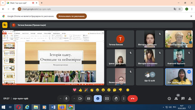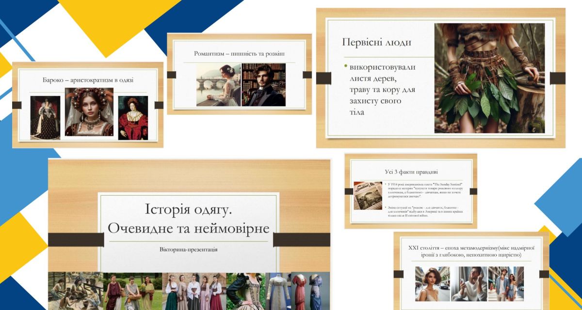 05 лютого 2025 року доктор філософії, голова циклової комісії професійної освіти, викладачка фахових дисциплін Тетяна Бикова провела для студентів цієї ОПП онлайн вікторину-презентацію «Історія одягу. Очевидне та неймовірне». Захід був організований з метою популяризації вибіркового освітнього компоненту «Історія дизайну костюма і матеріальної культури».