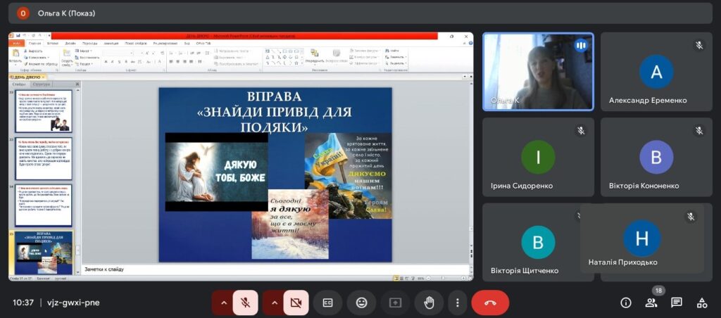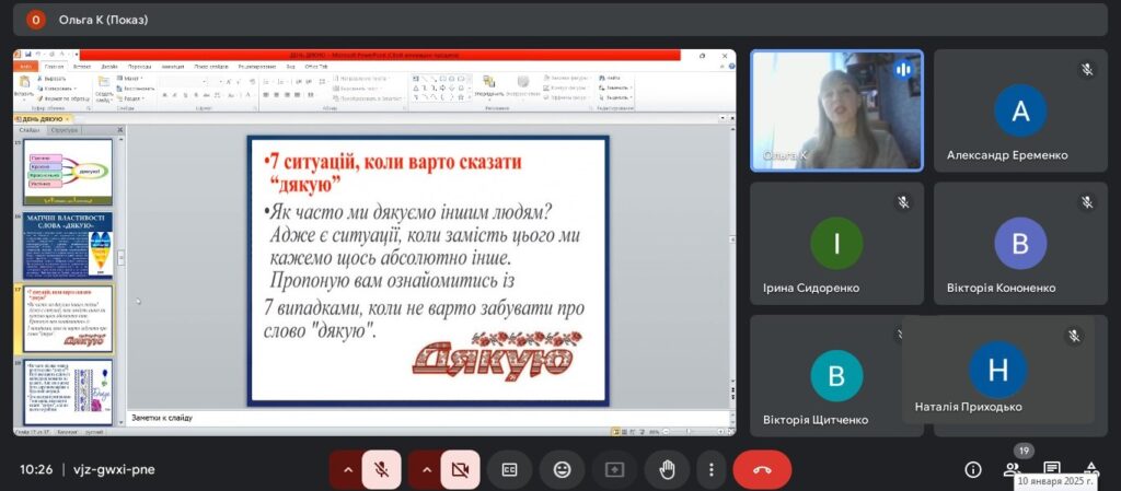 10 січня 2025 р. практичний психолог Ольга Капоріна провела зі здобувачами освіти годину спілкування (онлайн) «Необхідне та важливе слово «Дякую», присвячений Міжнародному дню «Дякую», що відзначається 11 січня.