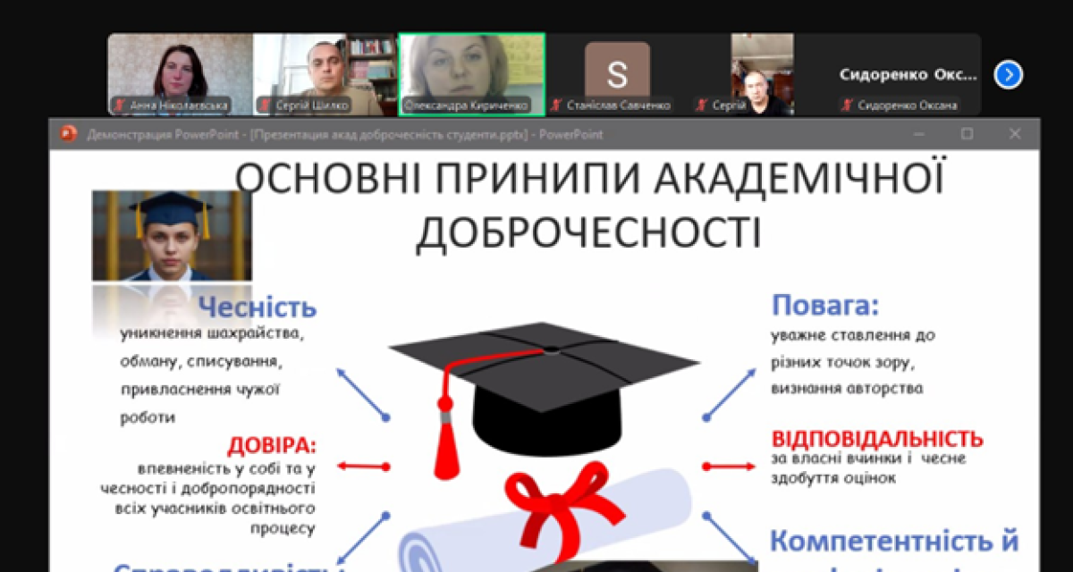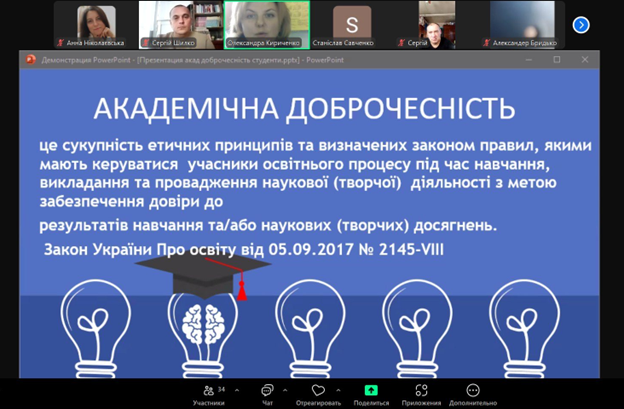 Олександра Кириченко звернула увагу на важливість дотримання вимог та правил, якими мають керуватися учасники освітнього процесу під час навчання, викладання з метою забезпечення довіри до результатів навчання та наукових досягнень. Ознайомила присутніх з основними принципами академічної доброчесності.