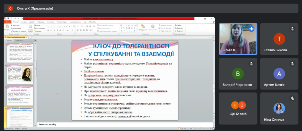 12 листопад 2024 р. в рамках тижня толерантності практичний психолог Ольга Капоріна зі здобувачами освіти провела групову консультацію «Приємна розмова», метою якої було створення атмосфери єдності, підвищення позитивного настрою, розвиток уміння висловлювати свій емоційний стан, формування уявлення про важливість спілкування для розвитку людини.