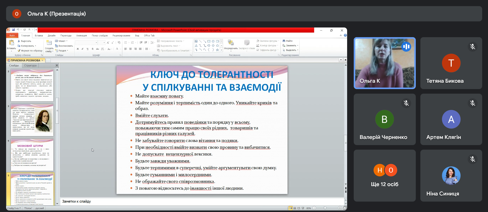 Запропоновані техніки «Мозковий штурм», «Ключ до толерантного спілкування», «Прапор толерантності» навчали учасників спілкуванню без словесних образ та мати розуміння і терпимість один до одного.