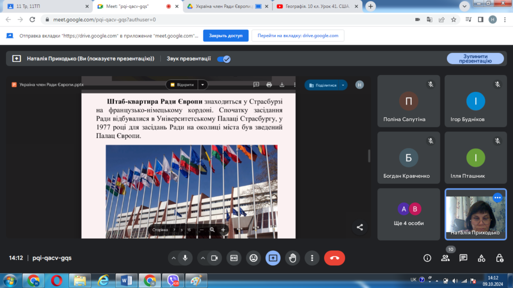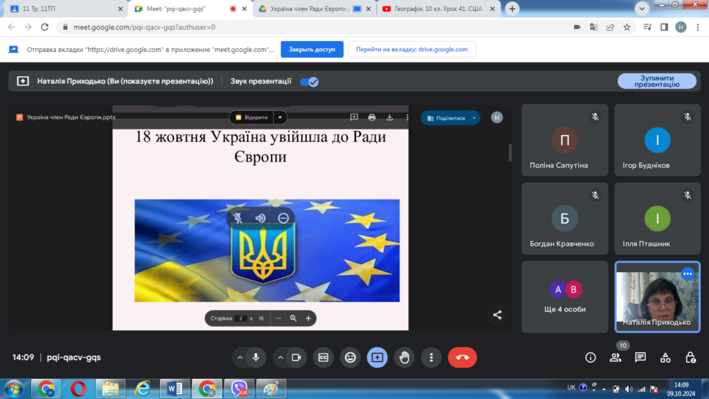 09 жовтня 2024 року з нагоди річниці вступу України в Раду Європи, що відзначається щороку 18 жовтня, викладач географії, керівник студентського наукового гуртка «Міжнародні організації» Наталія Приходько провела зі студентами І курсу спеціальності 015 Професійна освіта інформаційну годину «Україна – член Ради Європи».