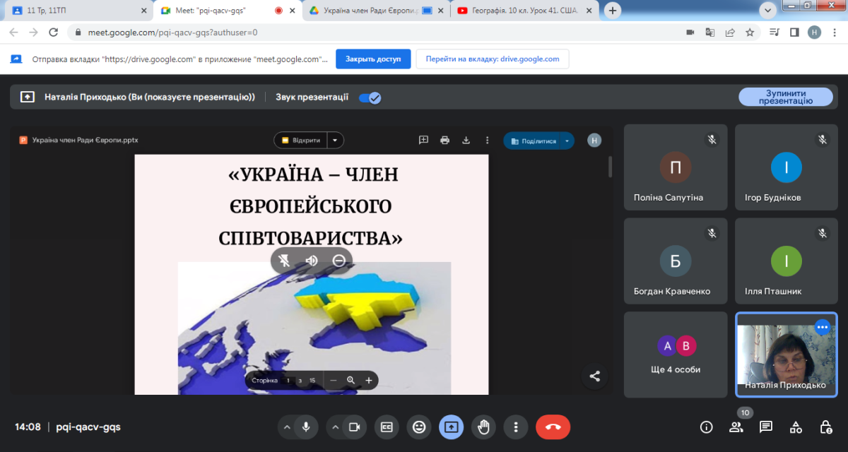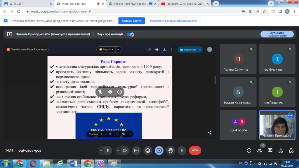09 жовтня 2024 року з нагоди річниці вступу України в Раду Європи, що відзначається щороку 18 жовтня, викладач географії, керівник студентського наукового гуртка «Міжнародні організації» Наталія Приходько провела зі студентами І курсу спеціальності 015 Професійна освіта інформаційну годину «Україна – член Ради Європи».
