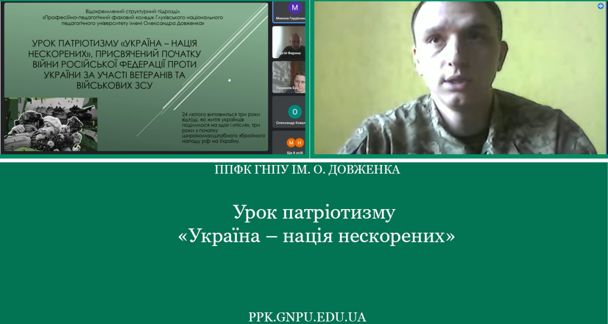 24 лютого 2024 року у ВСП «Професійно-педагогічний фаховий коледж Глухівського НПУ ім. О. Довженка» відбувся урок патріотизму «Україна – нація нескорених», приурочений до річниці повномасштабного вторгнення росії в Україну.