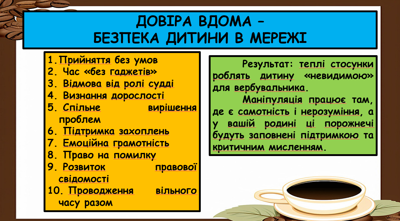 Із метою підвищення рівня обізнаності батьків студентів про загрози вербування та маніпуляцій дітьми в цифровому просторі, а також задля недопущення втягування молоді у протиправну діяльність, 26.02.2026 року практичним психологом Ольгою КАПОРІНОЮ було проведено зустріч із батьками здобувачів освіти у формі кіберкав’ярні «Інформаційний імунітет. Створюємо безпечне середовище разом» із нагоди відзначення Дня Безпечного інтернету та Міжнародного дня протидії булінгу.