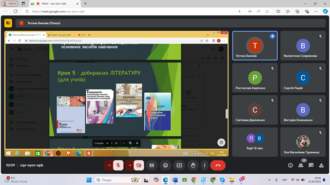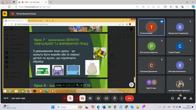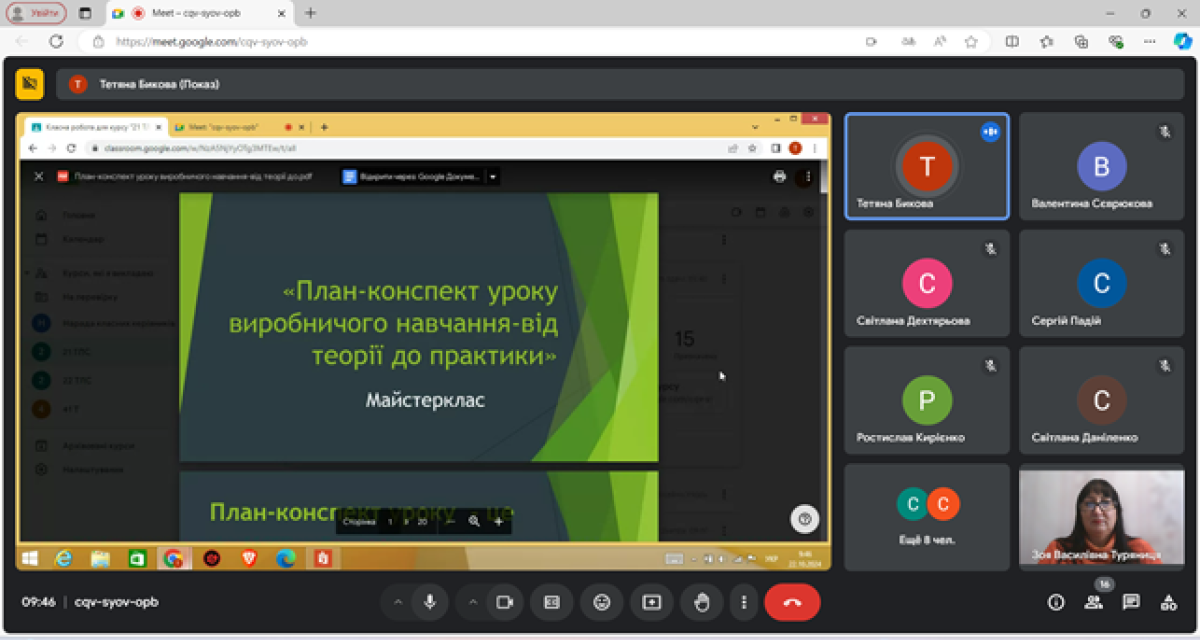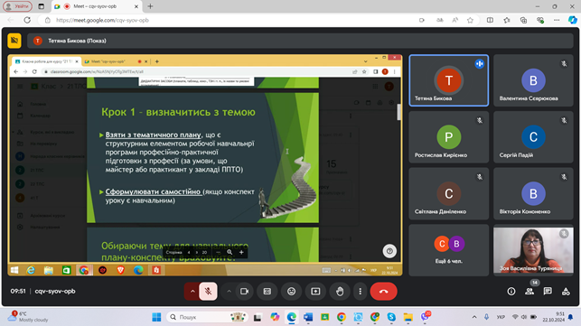 22 жовтня 2024 року, під час тижня циклової комісії професійної освіти та педагогічної (безвідривної) практики, викладачем освітнього компоненту «Організація та методика професійного навчання» в режимі онлайн було проведено майстерклас «План-конспект уроку виробничого навчання – від теорії до практики».