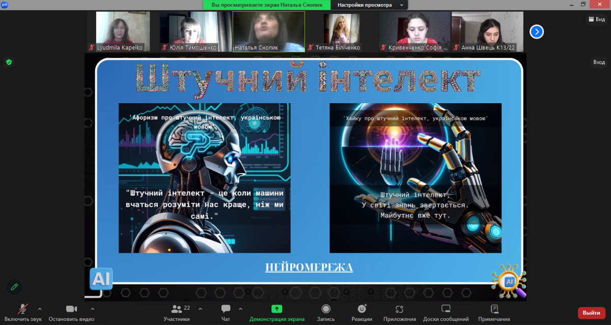 Спікерка Наталія Снопик, педагог з багаторічним стажем роботи Запорізької загальноосвітньої школи І-ІІІ ступенів № 97 поділилася власним досвідом використання штучного інтелекту в педагогічній практиці та звернула увагу, як нейромережа може полегшити роботу вчителя, індивідуалізувати навчання, а також зробити його цікавішим і більш інтерактивним для учнів.