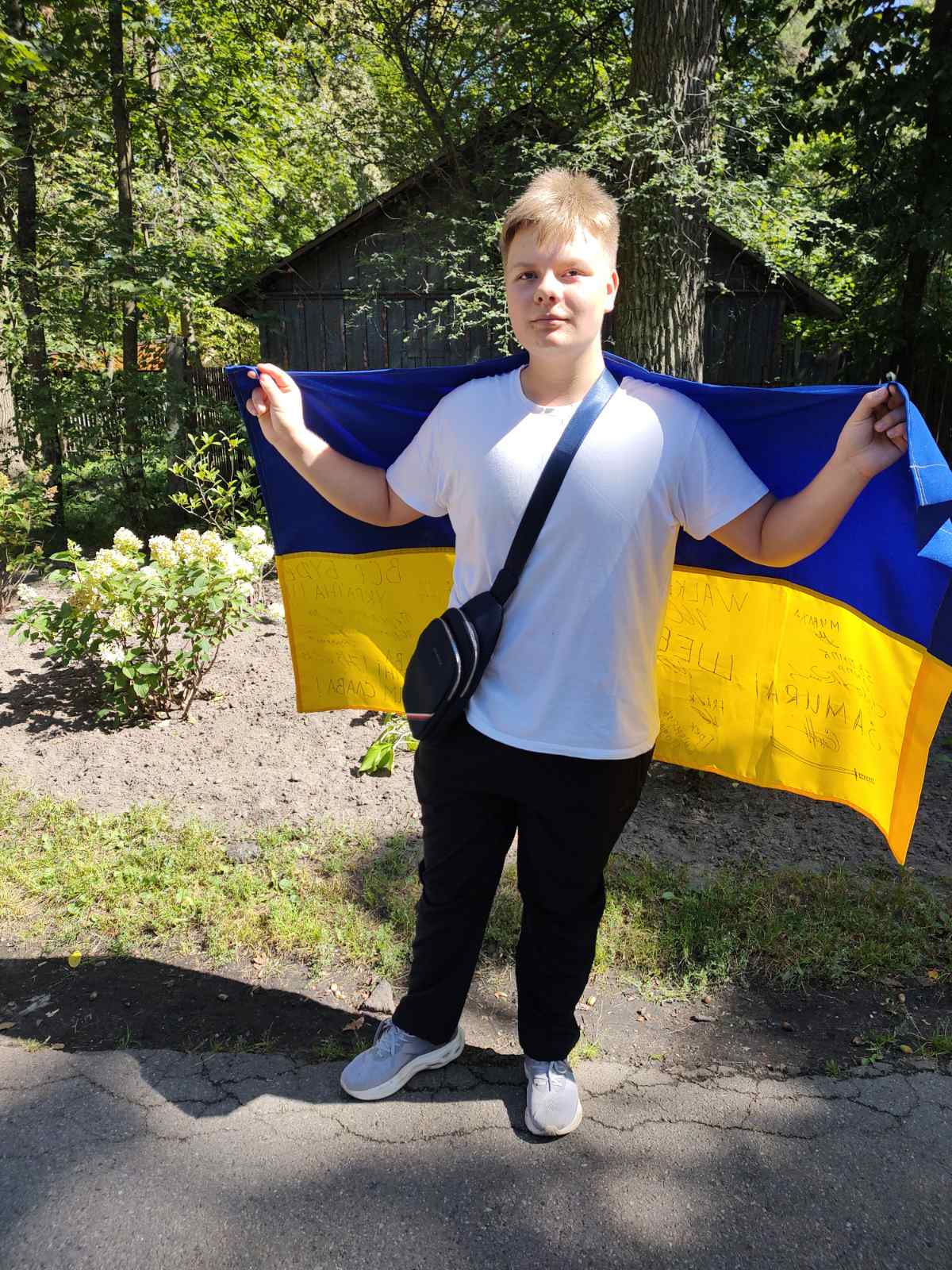 Максим Буровцев долучився до флешмобу до Дня державного прапора України, розгорнувши прапор України з підписами і побажаннями військових, які отримали допомогу від волонтерського центру коледжу.