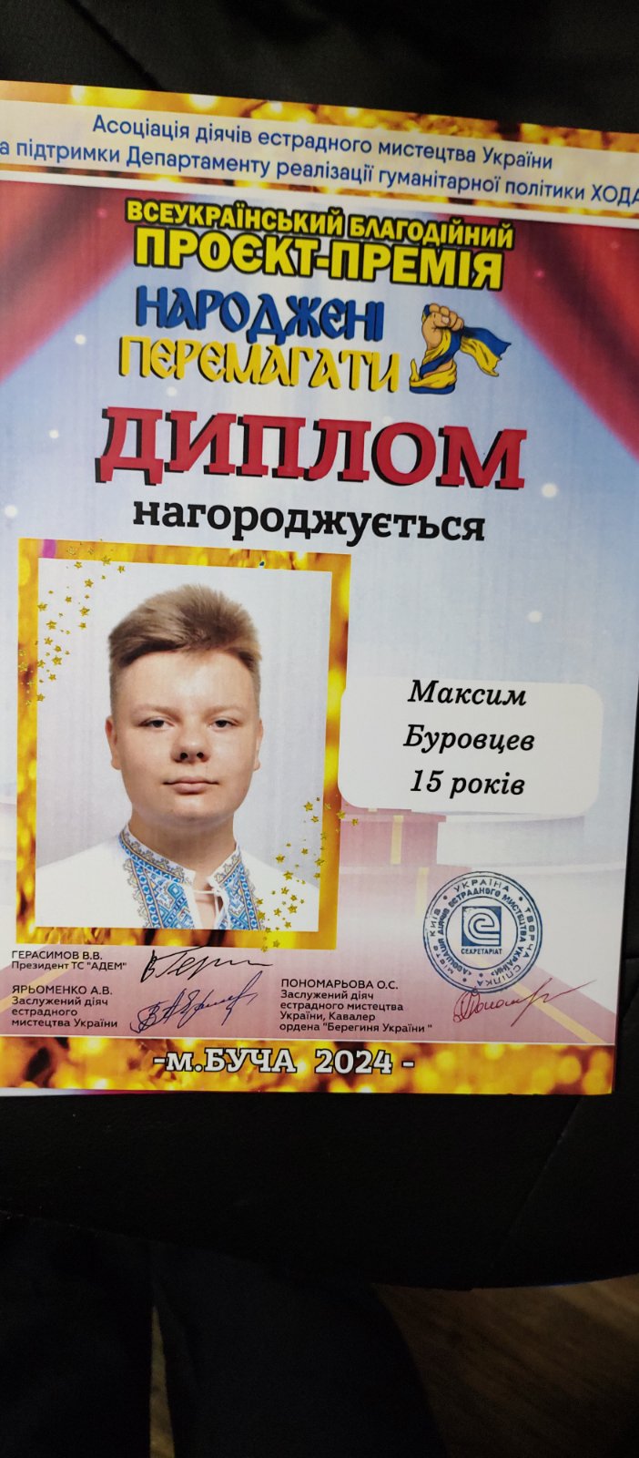 Студент І курсу спеціальності 015 Професійна освіта (Аграрне виробництво, переробка сільськогосподарської продукції та харчові технології) Максим Буровцев узяв участь у Всеукраїнському проєкті-премії «Народжені перемагати», що був присвячений 33-й річниці Незалежності України.