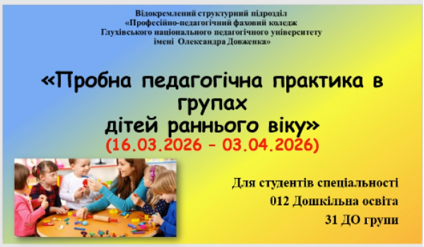 Здобувачі освіти ознайомилися з метою, завданнями, програмою педагогічної практики (пробні уроки) та особливостями оформлення звітної документації. Практика проходитиме в онлайн-форматі на базі ВСП «Професійно-педагогічний фаховий коледж Глухівського НПУ ім. О. Довженка».