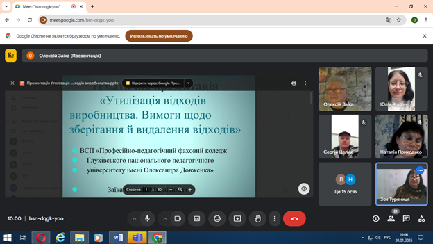 30 січня 2025 року учасники освітнього процесу коледжу долучилися до виховного заходу, що проходив у формі тематичної презентації «Утилізація відходів виробництва. Вимоги щодо зберігання й видалення відходів», у рамках виконання Національного плану управління відходами до 2030 року. Захід організував та провів викладач фахових дисциплін Олексій Заїка.