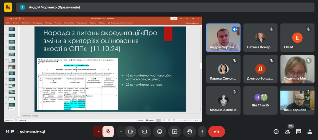 07 листопада 2024 року відбулося чергове онлайн-засідання обласного методичного об’єднання заступників директора з навчально-методичної роботи закладів фахової передвищої освіти Сумської області, у роботі якого взяв участь заступник директора з навчальної роботи ВСП «Професійно-педагогічний фаховий коледж Глухівського НПУ ім. О. Довженка» Іван Гаврилов. Під час засідання розглядалися питання щодо сучасних викликів в організації освітнього процесу у фаховій передвищій освіті.