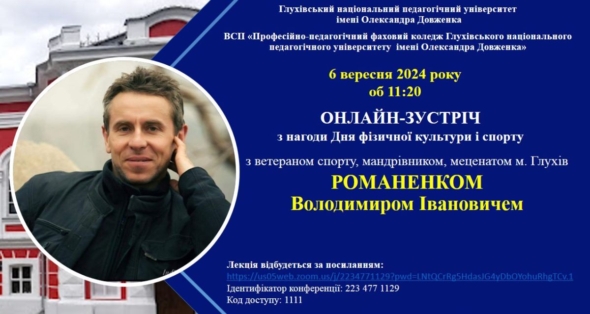06 вересня 2024 року у переддень Дня фізичної культури і спорту студенти та викладачі коледжу відвідали онлайн-зустріч з ветераном спорту, мандрівником, підприємцем, меценатом багатьох проєктів в м. Глухові Володимиром Романенком.
