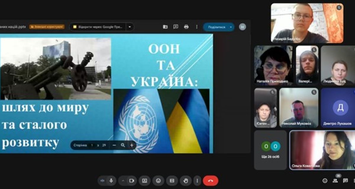 27 жовтня 2025 року викладач географії Наталія Приходько, у рамках роботи предметного гуртка «Географія європейського простору», провела онлайн-захід у формі інформаційної години «ООН та Україна: шлях до миру та сталого розвитку», присвячений Міжнародному дню Організації Об’єднаних Націй (24 жовтня).