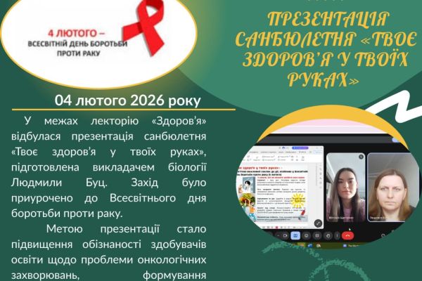 ПРЕЗЕНТАЦІЯ САНБЮЛЕТНЯ «ТВОЄ ЗДОРОВ’Я У ТВОЇХ РУКАХ» ДО ВСЕСВІТНЬОГО ДНЯ БОРОТЬБИ ПРОТИ РАКУ
