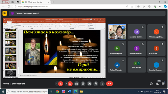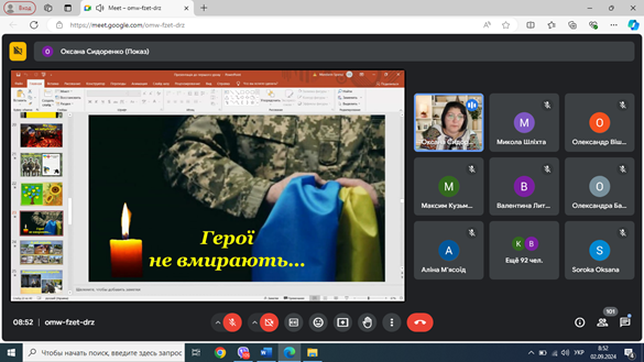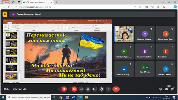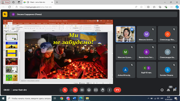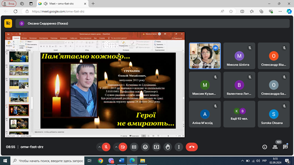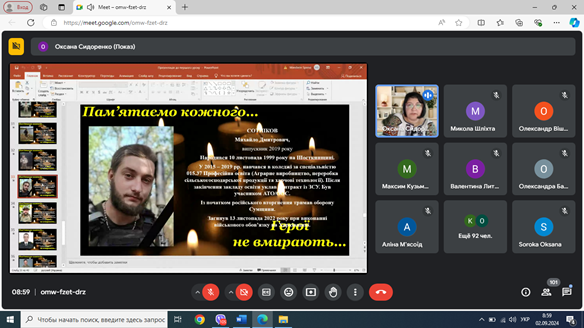 02 вересня викладач історії Оксана Сидоренко провела загальноколеджну тематичну виховну годину на тему «Vincit qui meminit (Перемагає той, хто пам’ятає)», на якому разом із здобувачам освіти пригадали як почалося віроломне вторгнення російських загарбників в Україну. Говорили про мужність та безстрашність українців, які з перших днів повномасштабного вторгнення одягли військову форму, взяли зброю до рук і стали на захист Батьківщини. А також пригадали Героїв, випускників закладу освіти, які віддали свої життя за свободу України, за волю українського народу, за мирне майбутнє своїх нащадків.
