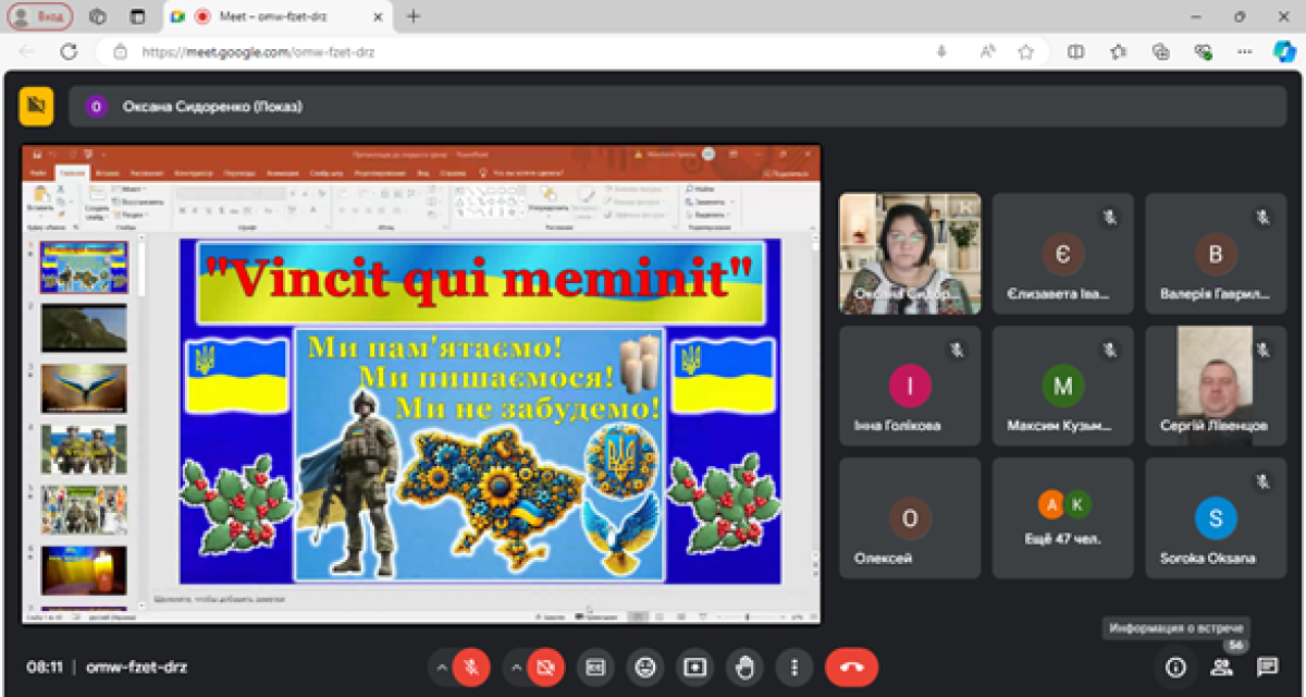 02 вересня викладач історії Оксана Сидоренко провела загальноколеджну тематичну виховну годину на тему «Vincit qui meminit (Перемагає той, хто пам’ятає)», на якому разом із здобувачам освіти пригадали як почалося віроломне вторгнення російських загарбників в Україну. Говорили про мужність та безстрашність українців, які з перших днів повномасштабного вторгнення одягли військову форму, взяли зброю до рук і стали на захист Батьківщини. А також пригадали Героїв, випускників закладу освіти, які віддали свої життя за свободу України, за волю українського народу, за мирне майбутнє своїх нащадків.