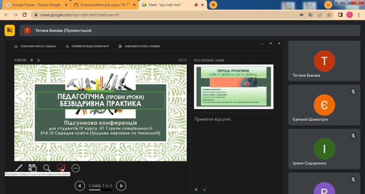 Відповідно до графіку освітнього процесу 22 листопада 2024 р. у дистанційному форматі було проведено підсумкову конференцію з педагогічної практики (пробні уроки) для студентів денної форми навчання 41Т групи спеціальності 014.10 Середня освіта (Трудове навчання та технології).