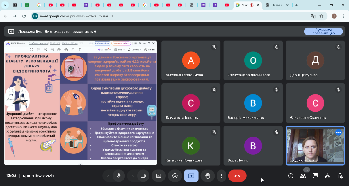 13 листопада 2024 року в рамках роботи лекторію «Здоров‘я» викладач Людмила Буц організувала презентацію санбюлетня «Профілактика діабету. Рекомендації лікаря-ендокренолога» з нагоди Всесвітнього дня боротьби із захворюванням на діабет, що відзначається щороку 12 листопада.