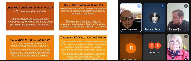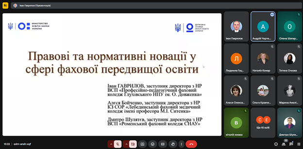 У роботі засідання взяв участь Іван Гаврилов, заступник директора з навчальної роботи ВСП «Професійно-педагогічний фаховий коледж Глухівського НПУ ім. О. Довженка», який виступив із доповіддю «Правові та нормативні новації у сфері фахової передвищої освіти». Доповідь була підготовлена спільно з колегами — Алесею Бойченко, заступником директора з навчальної роботи КЗ СОР «Лебединський фаховий медичний коледж імені професора М.І. Ситенка», та Дмитром Шулятєвим, заступником директора з навчальної роботи ВСП «Роменський фаховий коледж СНАУ».