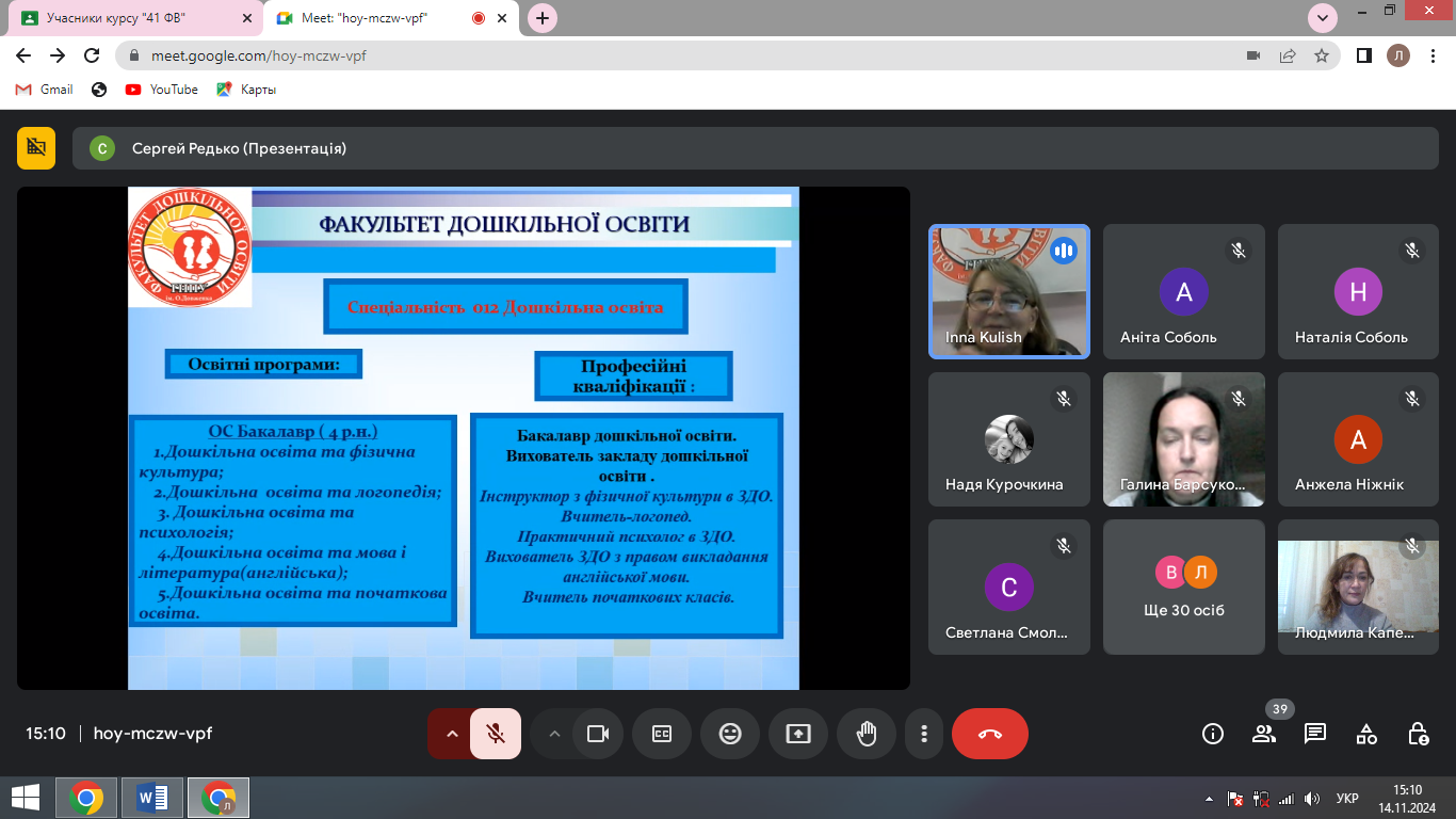 14 листопада 2024 року у рамках роботи Центру сприяння працевлаштування ВСП «Професійно-педагогічний фаховий коледж Глухівського НПУ ім. О. Довженка» для студентів випускних груп спеціальностей 012 Дошкільна освіта та 014.11 Середня освіта (Фізична культура) було проведено профорієнтаційну зустріч із деканом факультету дошкільної освіти Глухівського НПУ ім. О. Довженка Інною Куліш, старшим викладачем кафедри дошкільної педагогіки і психології Галиною Борсуківською та старшим викладачем кафедри теорії і методики фізичного виховання Сергієм Редьком.
