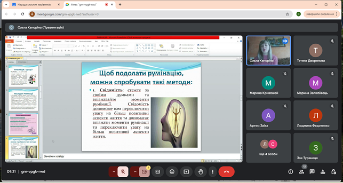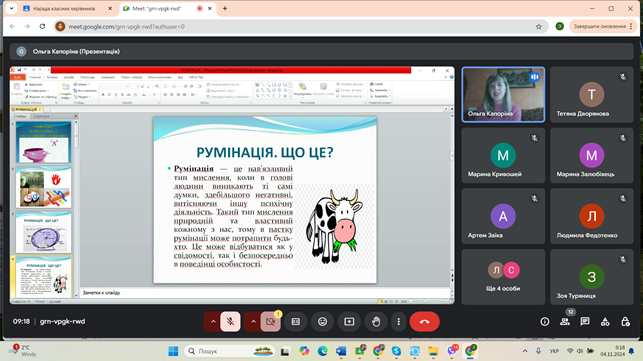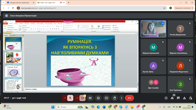 04 листопада 2024 року на черговій ранковій зустрічі педагогів у рамках проєкту «Завжди поруч» практичний психолог Ольга Капоріна запропонувала опрацювати техніки «Сейф» та «Дозвіл на тривогу», що допомагають навчитися довільно перемикати увагу з нав’язливих думок і непродуктивного аналізу подій минулого, звільнивши розумові ресурси для пошуку реального вирішення проблемної ситуації.