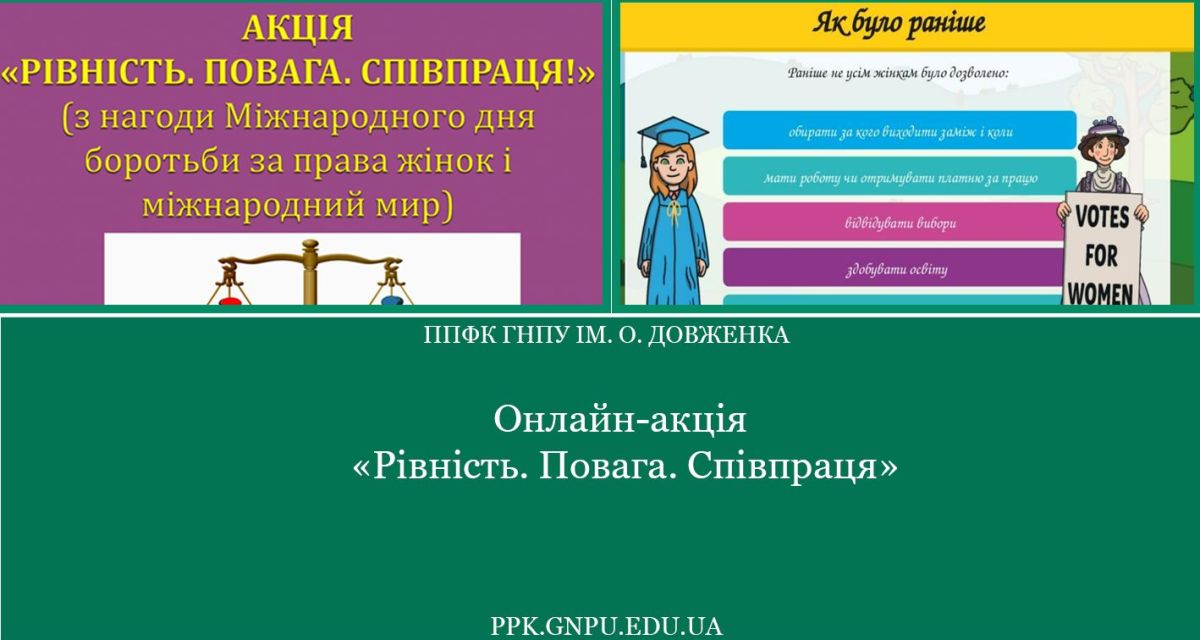 Важливим критерієм оцінки якості освітнього процесу є врахування гендерних аспектів, забезпечення рівного доступу до освіти та виховання культури прав людини. Проведення практичним психологом Ольгою Капоріною онлайн-акції «Рівність. Повага. Співпраця» (07 березня 2025 року) присвячена Міжнародному дню боротьби за права жінок і міжнародний мир, що відзначається щороку 08 березня, стало важливим елементом забезпечення цих стандартів, сприяючи формуванню гендерної культури та розширенню соціального світогляду здобувачів освіти.