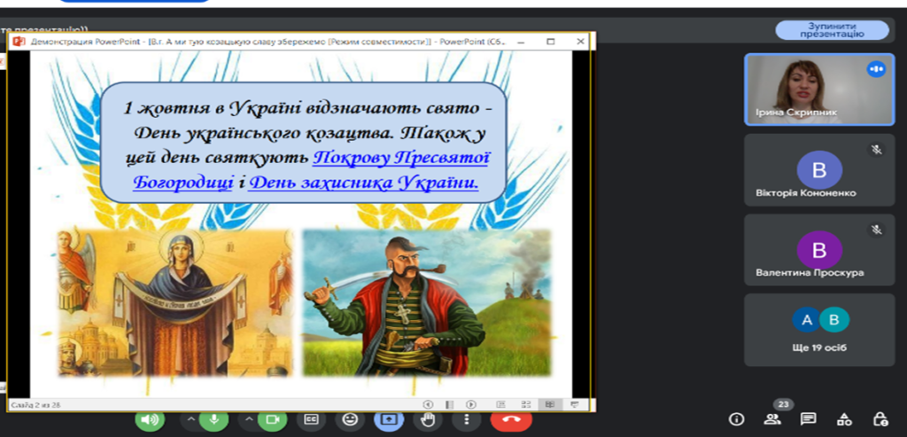 07 жовтня 2024 року викладач Ірина Скрипник провела тематичну виховну годину «А ми тую козацькую славу збережемо!», присвячену Дню українського козацтва, що відзначається в Україні 01 жовтня.
