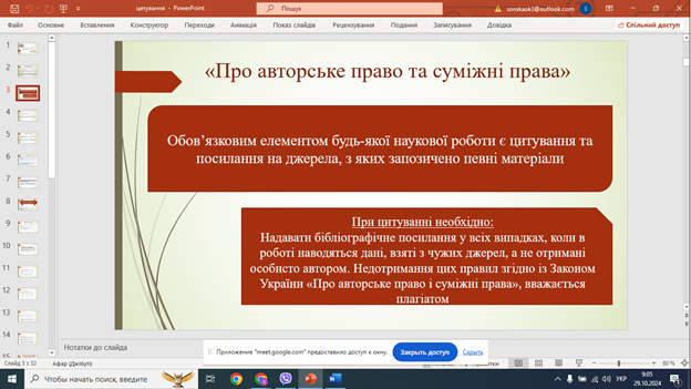 У рамках Плану роботи комісії з питань етики та академічної доброчесності 29 жовтня 2024 року викладач української мови та літератури Оксана Сорока провела тренінг «Правила цитування та бібліографічних описів» для здобувачів освіти 2-3 курсів, які працюють над написанням курсових робіт.