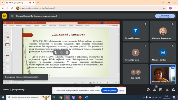Вона нагадала про поняття та принципи академічної доброчесності, розповіла про види та правила цитування, акцентувала увагу на складанні бібліографічних описів.