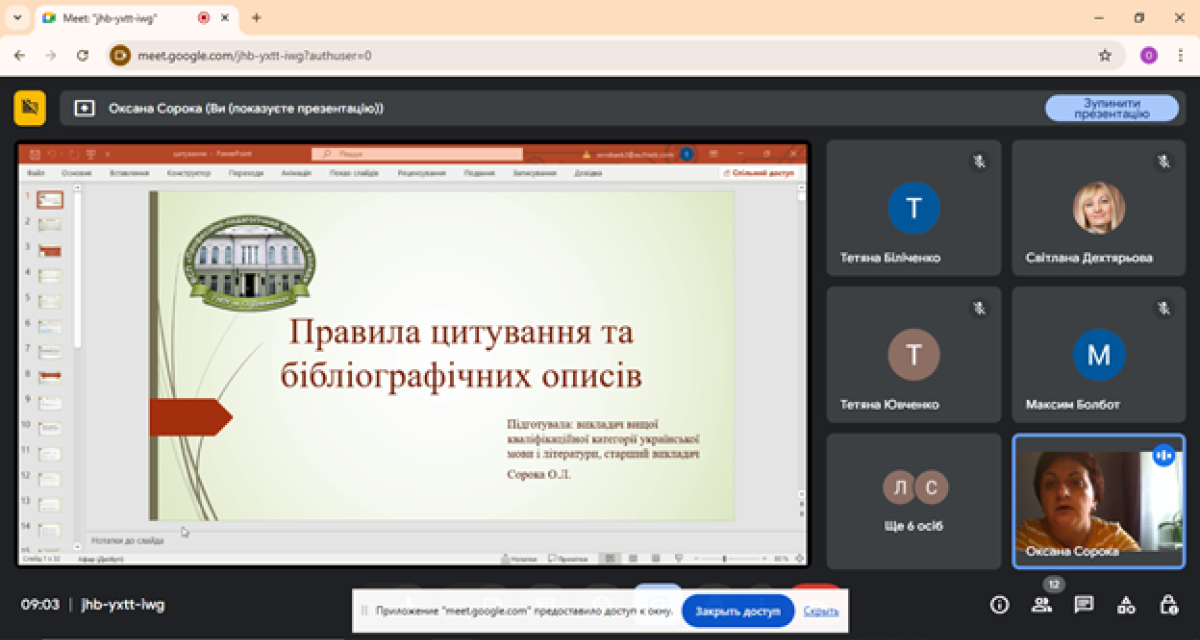 Вона нагадала про поняття та принципи академічної доброчесності, розповіла про види та правила цитування, акцентувала увагу на складанні бібліографічних описів.