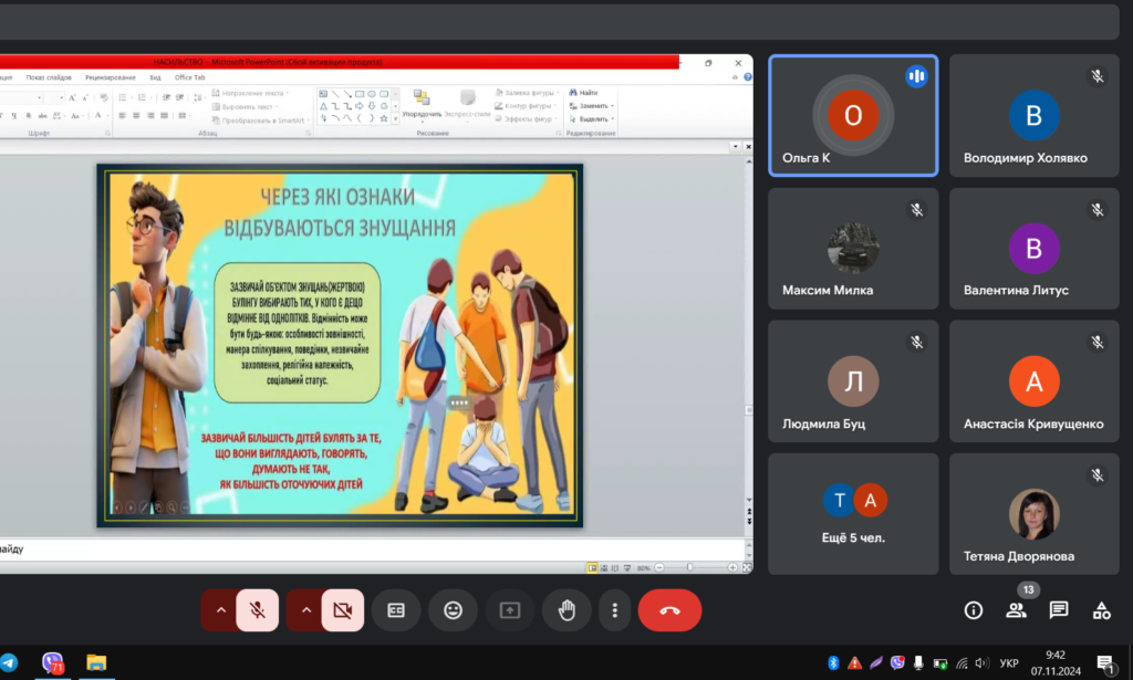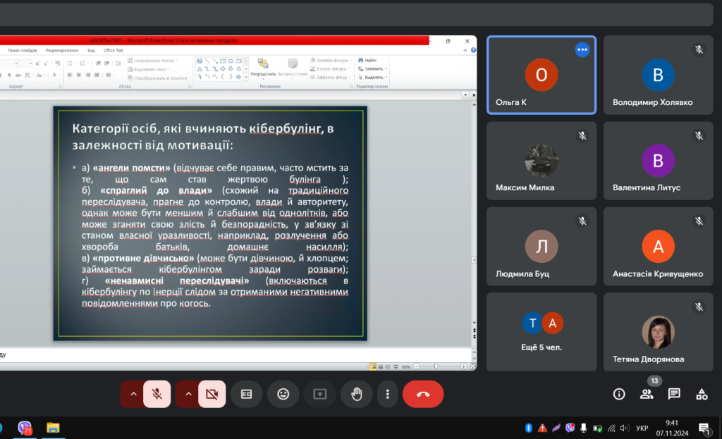 Проведене 07 листопада 2024 р. практичним психологом Ольгою Капоріною тренінгове заняття «Стоп булінг!» зі студентами та педагогами присвячено профілактиці запобігання та протидії проявам насильства, булінгу(цькування) та кібербулінгу в коледжі.