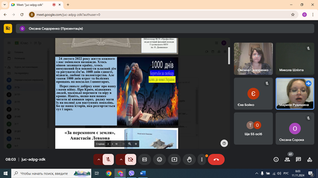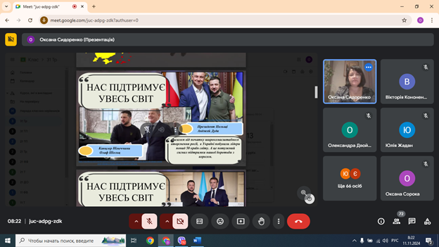 19 листопада 2024 року виповнюється тисяча днів від початку повномасштабного вторгнення російської федерації в Україну. З метою формування у молодого покоління сталих знань про героїчну боротьбу Українського народу проти московської агресії за утвердження національної та громадянської ідентичності, віддання шани героїчному подвигу захисників і захисниць України, ветеранів, військовослужбовців, добровольців, волонтерів, які захищали чи захищають суверенітет і територіальну цілісність держави, викладач історії Оксана Сидоренко 11 листопада 2024 року провела урок патріотизму «Відлік незламності: 1000 днів на шляху до Перемоги».