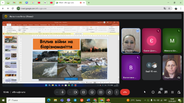 Члени студентської проблемної групи «Еколог» презентували свої доповіді: Валентина Литус – «Вплив війни на біорізноманіття», Валентина Проскура – «Збереження біорізноманіття».